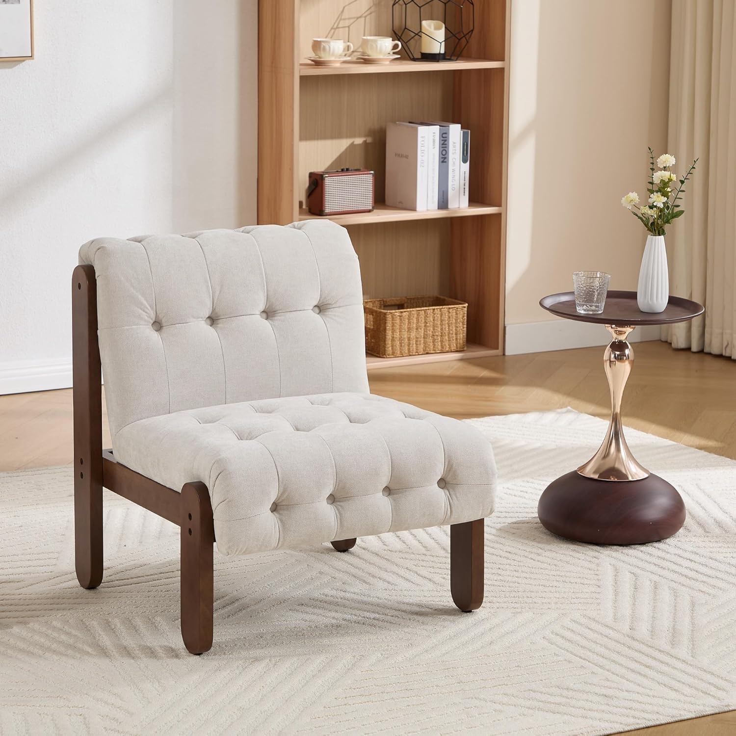 Modern Armless Accent Chair for Living Room, Soft Beige Linen Button Tufted Upholstered Lounge Reading Chair with Walnut Wood Frame