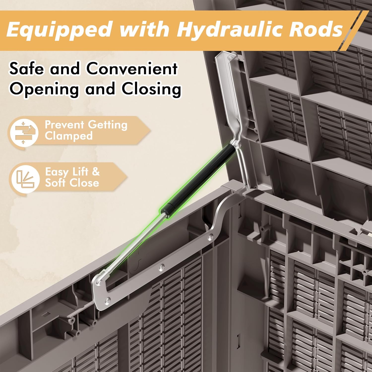 - ๐ Hydraulic Lid with Lockable Design for Safe Access Equipped with hydraulic gas lift rods, the lid opens smoothly and closes gently to prevent pinched fingers. The lockable lid adds an extra layer of security, making it an ideal choice for shared outdoor spaces or secure backyard storage. (Lock not included)