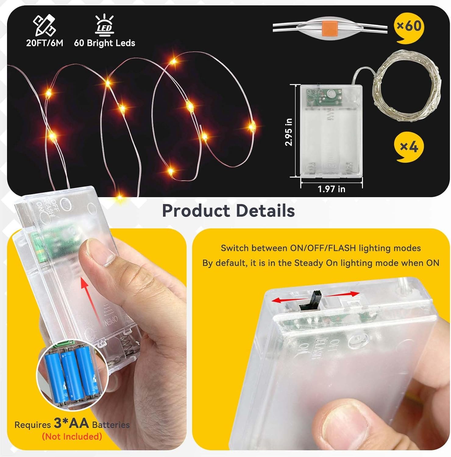 - Ultra-Bright Fairy Lights Battery Operated: Each pack includes 4 separate copper wire fairy lights, each featuring 60 brilliant LED bulbs, for a total length of 20FT. Effortlessly illuminate and decorate multiple areas like bedrooms, bookshelves, dining table centers, balconies, patios, and porchesβinstantly adding a warm, cozy glow to your holiday parties or daily home ambiance.