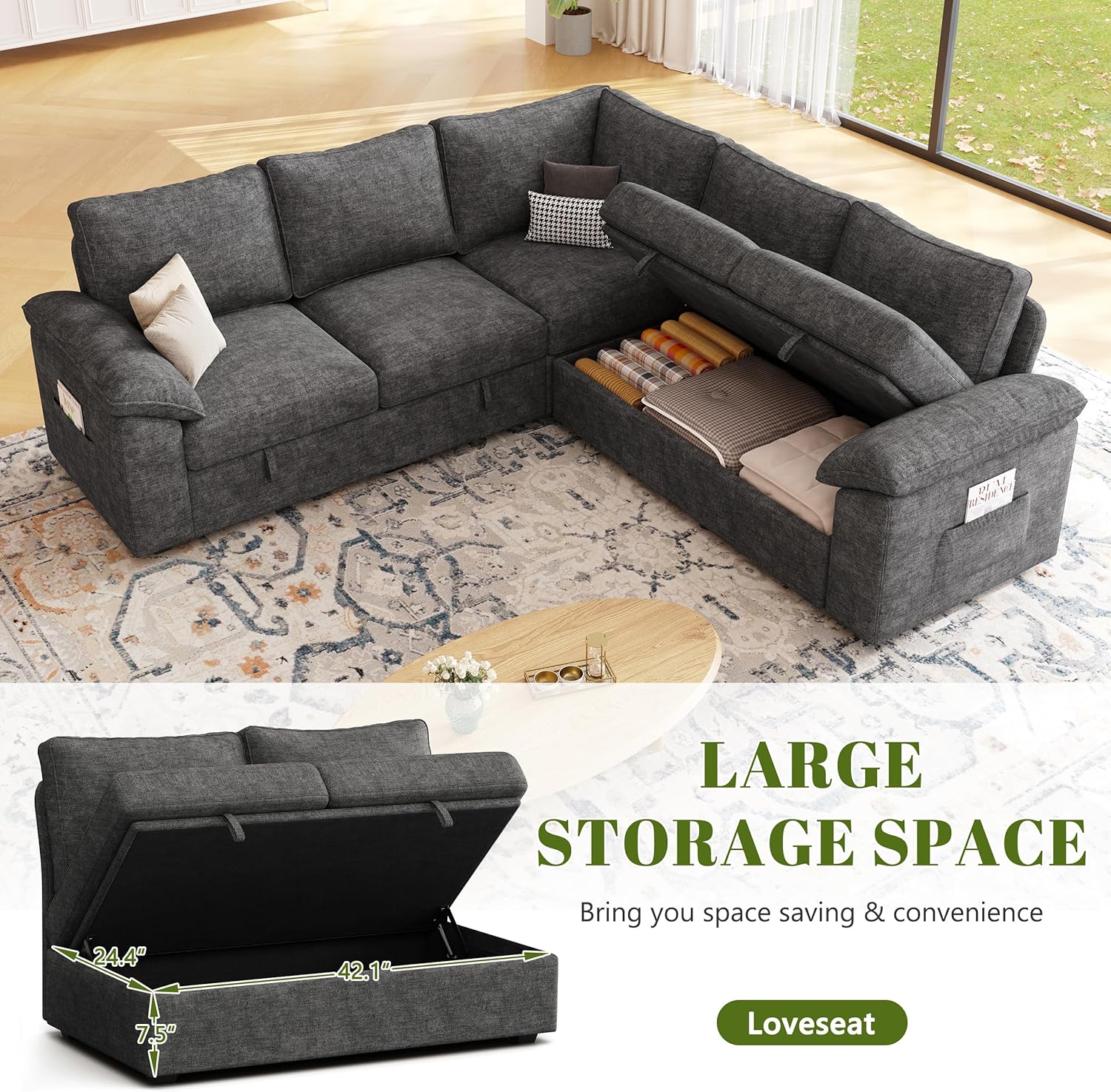 85 Inch Modular Sectional Sofa with Pull Out Bed,L Shaped 5 Seat Sectional Sleeper Sofa with Storage,Sectional Couches for Living Room,Cloud Modular Couch,Removable Sofa Cover,Dark Grey