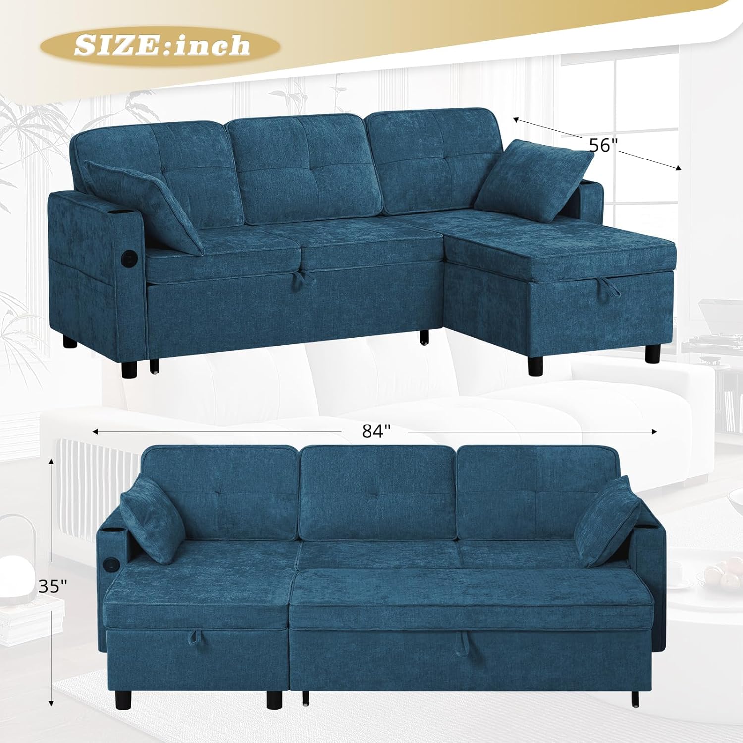 84 Inches Chenille Sectional Sofa w/Pull-Out Sofa Bed & Adjustable Back, Tufted L-Shaped Couch w/Storage Chaise, Sleeper Sectional Sofa w/USB Port & Cup Holders for Living Room, Blue