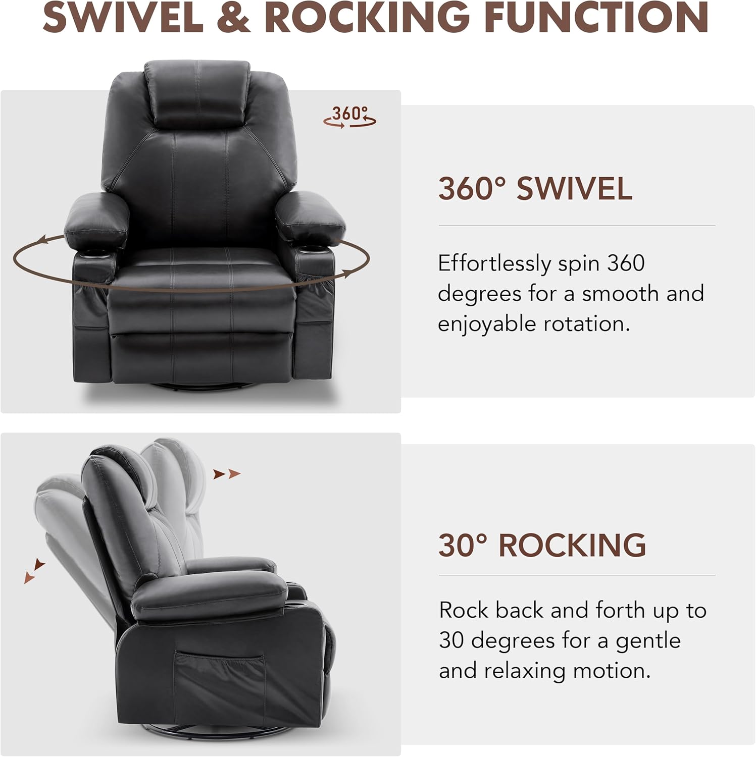 Swivel Rocker Recliner Chair with Heat and Massage, 360 Degree Swivel Rocking Single Sofa with Cup Holders and USB Port, Large Big Recliner Chair for Living Room (Leather, Black)