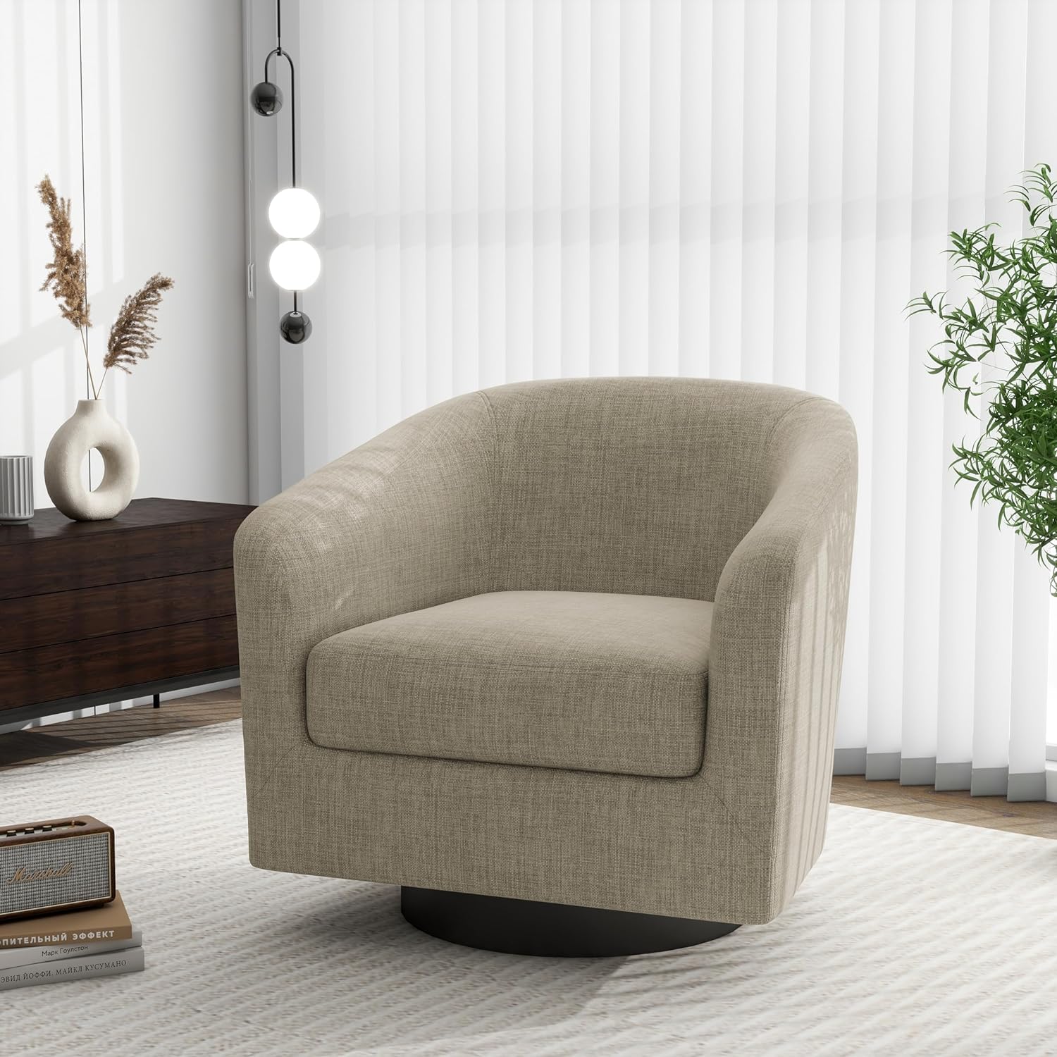 Swivel Barrel Accent Chair, Modern Round Linen Arm Chair for Living Room, Bedroom, Comfy Club Reading Chairs for Adults-Linen Fabric Light Brown, 1SEAT