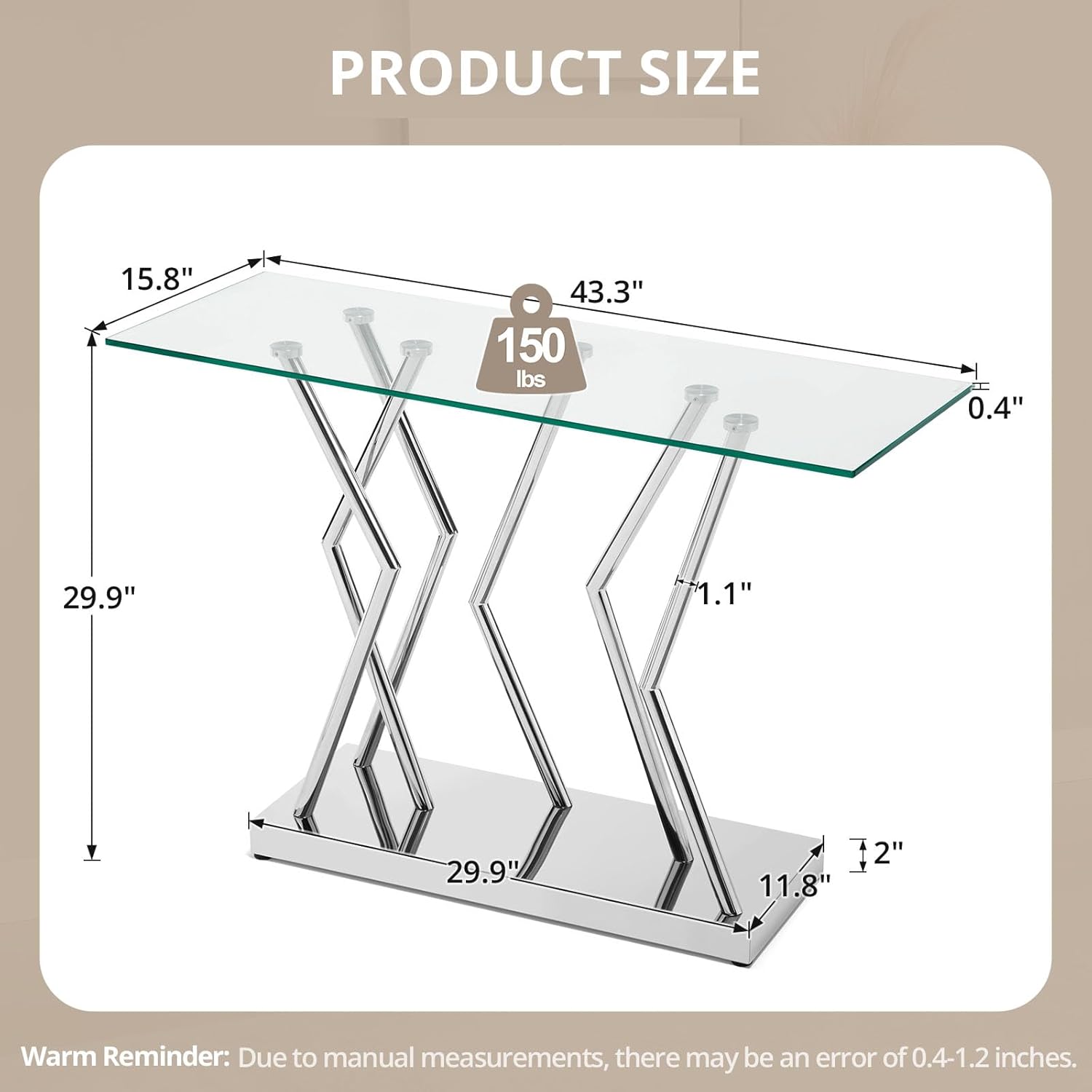 - 【Premium Tempered Glass Top for Elegance & Durability】 - Upgrade your space with our 43.3" modern console table. Our modern glass console table features a high-quality tempered glass top increase its durability. The ultra-clear 0.4" thick tempered glass tabletop Unlike cheaper alternatives, our glass does not turn yellow over time. Whether you prefer a rustic, modern, or transitional aesthetic, this console table effortlessly blends in while elevating your interior style.