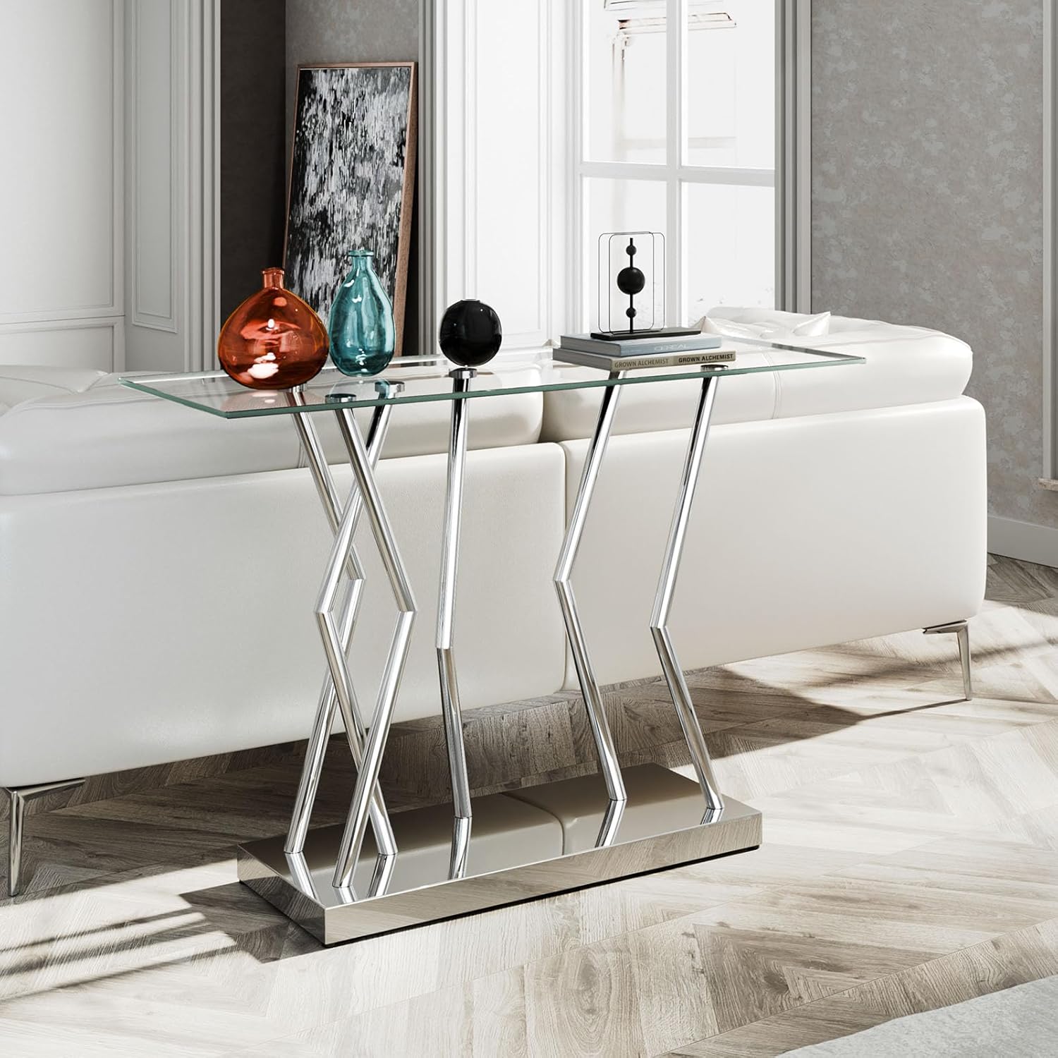 - 【Multi-Functional for Home & Office】 -Beyond its role as a chic entryway table, it serves as a sofa table for living rooms, a buffet table during gatherings, or a minimalist office desk. The neutral silver-and-glass palette blends with any color scheme, from bold accent walls to neutral Scandinavian interiors. In addition, the easy-to-clean surface makes it pet- and kid-friendly.