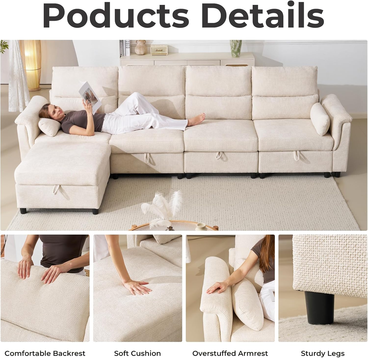 - Large storage space: Each seat of the modular couch is equipped with a spacious storage space, perfect for storing blankets, toys, pillows, and other items. This thoughtful design keeps your living space neat and tidy while maintaining a combination of comfort and functionality.