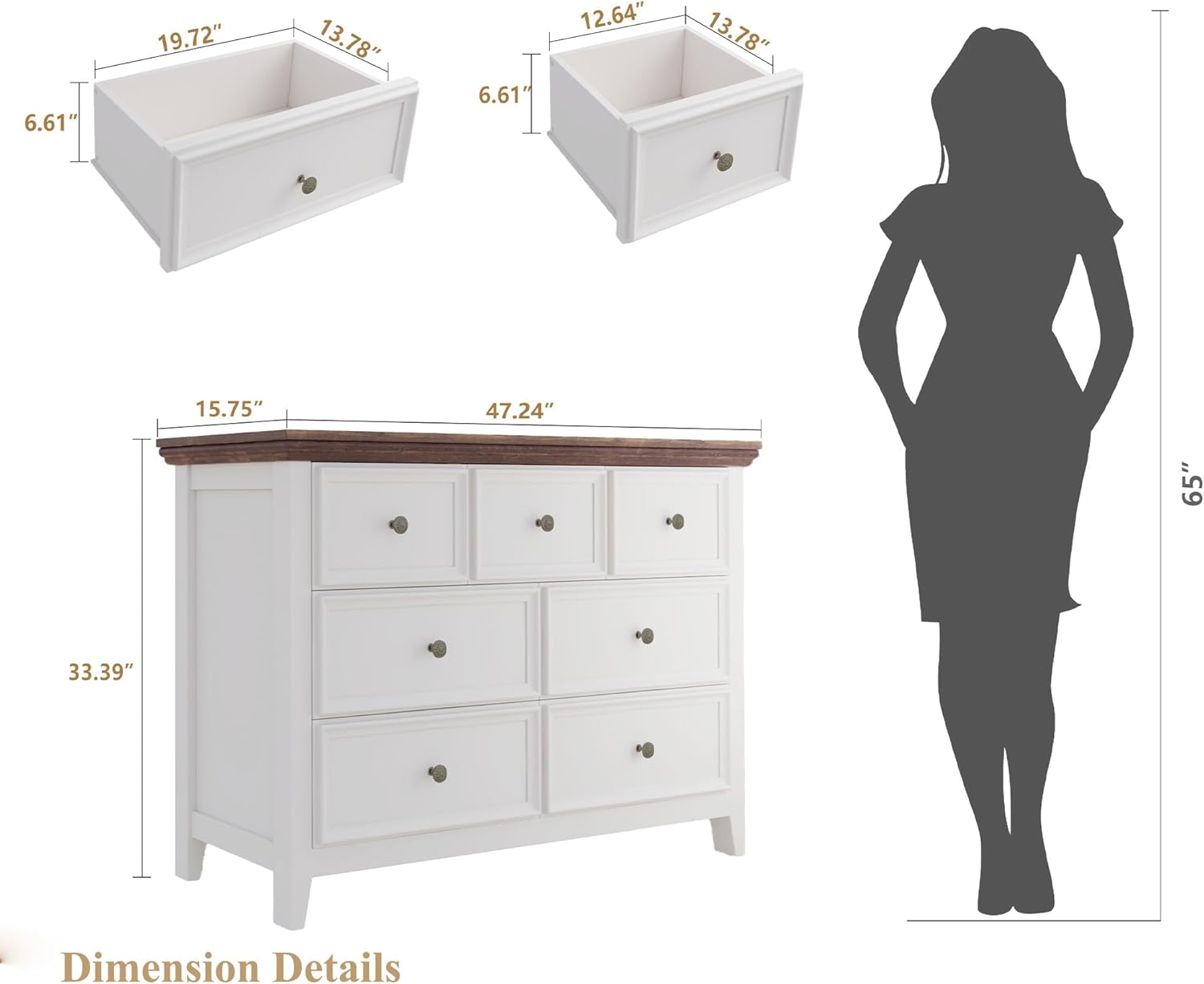 - γPerfect size for RoomγThe size of the assembled dresser measures 15.75"D x 47.24"W x 33.39"H to accent any wall. The smaller drawer measures 13.78"D x 12.64"W x 6.61"H and the bigger drawer measures 13.78"D x 19.72"W x 6.61"H to store a variety of items