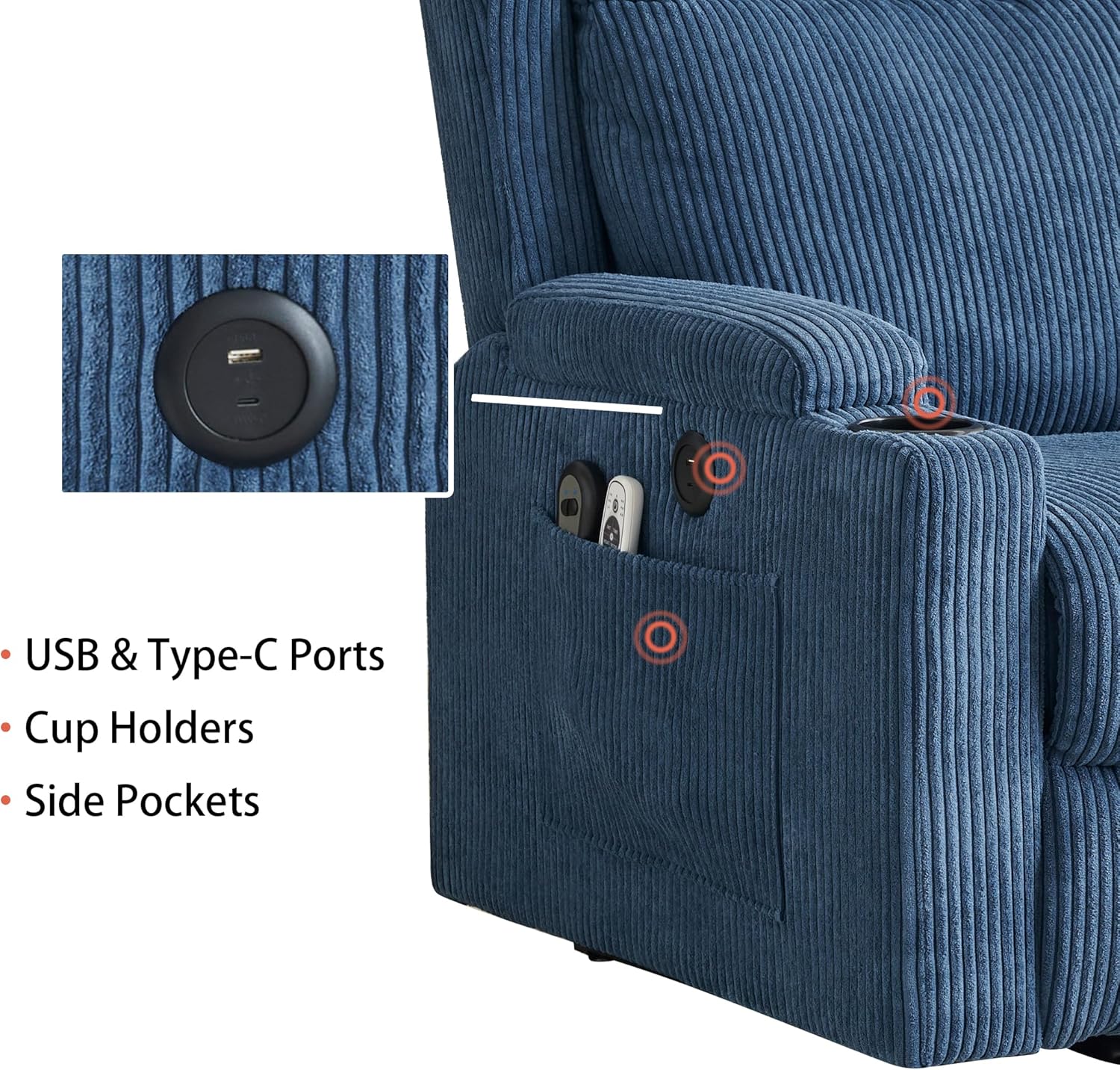 - ใPreferred Corduroy Fabricใ: The recliner chair for the elderly is made of high-quality corduroy fabric, cut as a whole and precision hand-sewn. The fabric is thick and the fiber structure is tight and not easy to wear. The surface velvet strips have a unique texture and retro style, adding to the beauty of your living room or bedroom.There are also USB & Type-C charging ports on the side of the chair for your convenience.