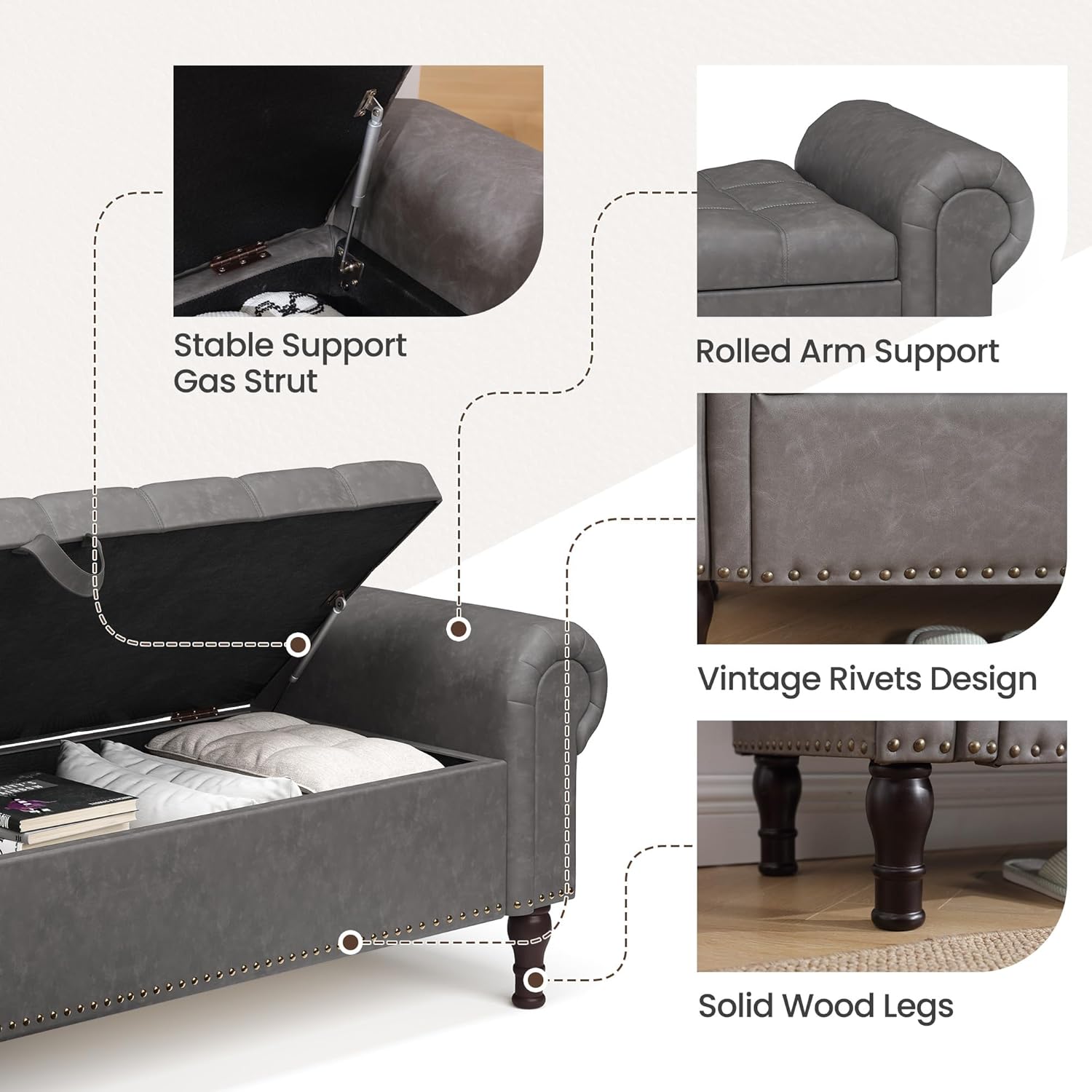 - 【STRUCTURAL STABILITY】The bedroom bench is made of multiple layers of wood panels, providing stable support. The bottom features 5.9 inch high solid wood legs, which are aesthetically pleasing and stable while protecting the floor from scratches. The internal gas rod support structure ensures smooth and steady opening and closing of the seat surface.