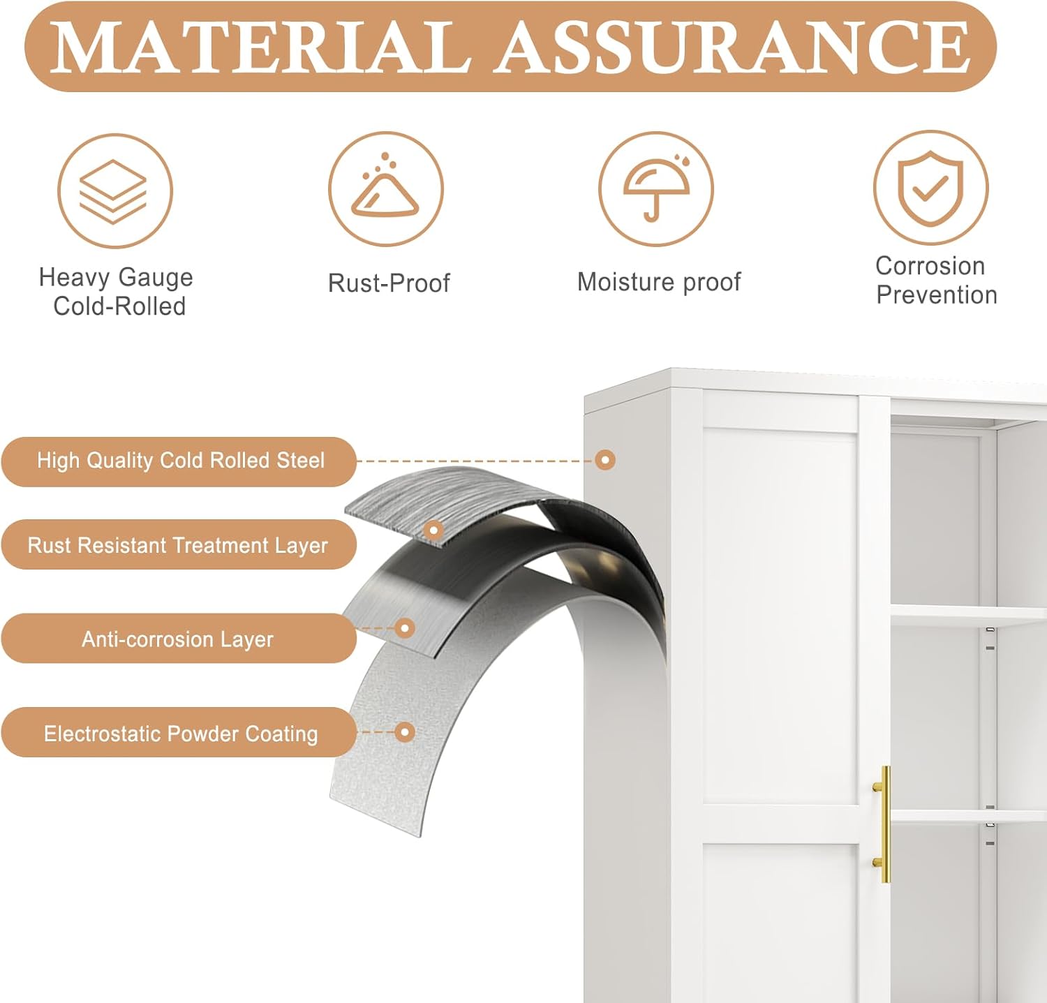 - π½γSturdy Metal StructureγOur storage cabinets are generously sized to unlock the potential of your space.3 adjustable shelves can easily accommodate your storage needs. Our Metal Kitchen Pantry Storage Cabinets are made of durable cold-rolled steel material, with a safe and environmentally friendly powder coating on the surface, which is rust-proof, anti-corrosion, and odorless, ensuring safe food storage. Not only does the metal construction provide a large load capacity of up to 120 pounds, but it also makes it scratch resistant.
