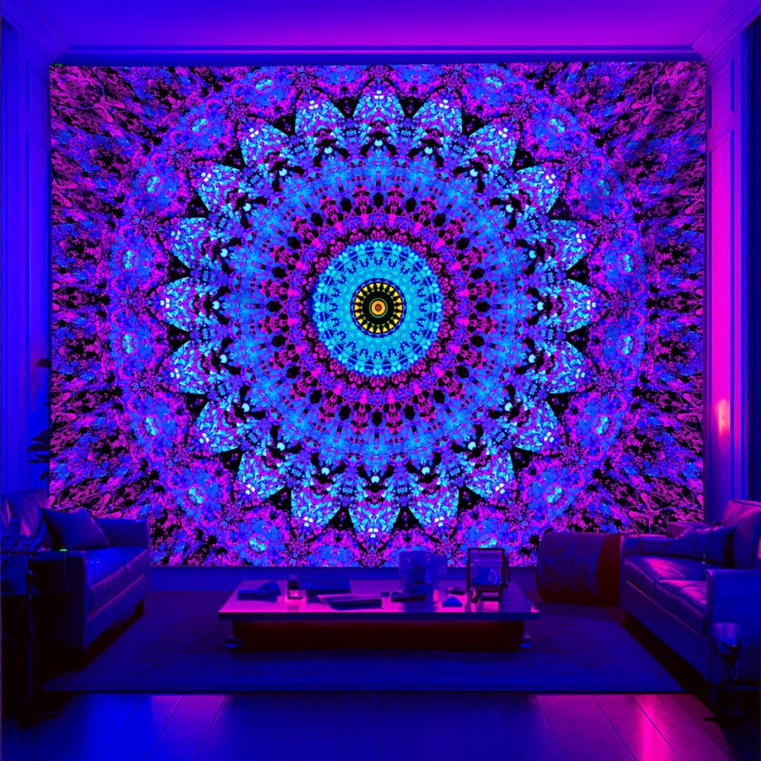 Blacklight Mandala Boho Tapestry, Black Light Bohemian Hippie Poster for Adults and Teens, UV Reactive Aesthetic Wall Art Decor for Bedroom (90 x 70 Inches)