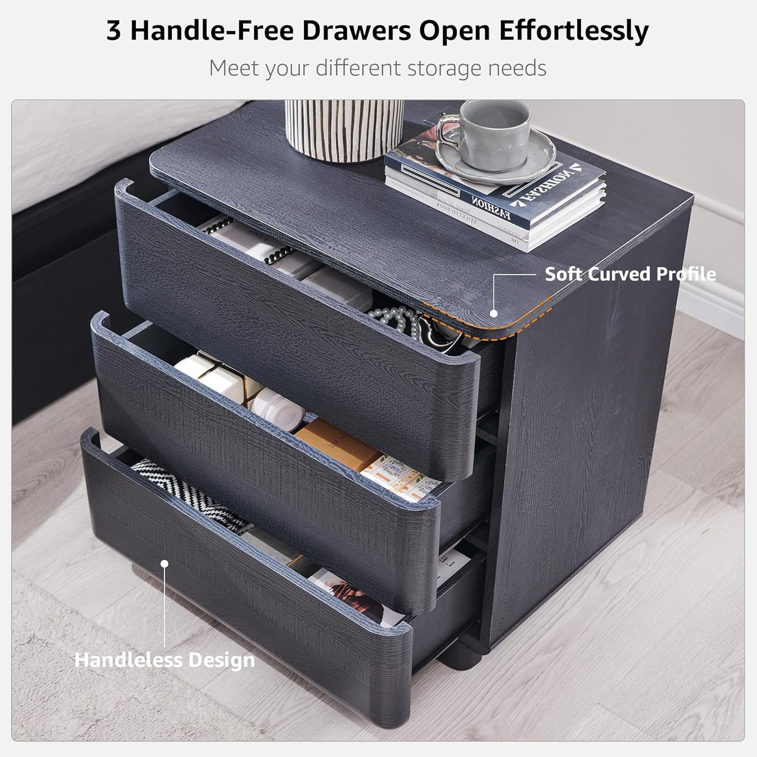 - Modern Style with Smooth Curves โ Safe & Stylish: Crafted with clean lines and rounded edges, this 22" modern nightstand delivers a sleek, minimalist look to any room. The handleless front and curved profile create a soft, family-friendly design that keeps sharp corners away from kids and pets